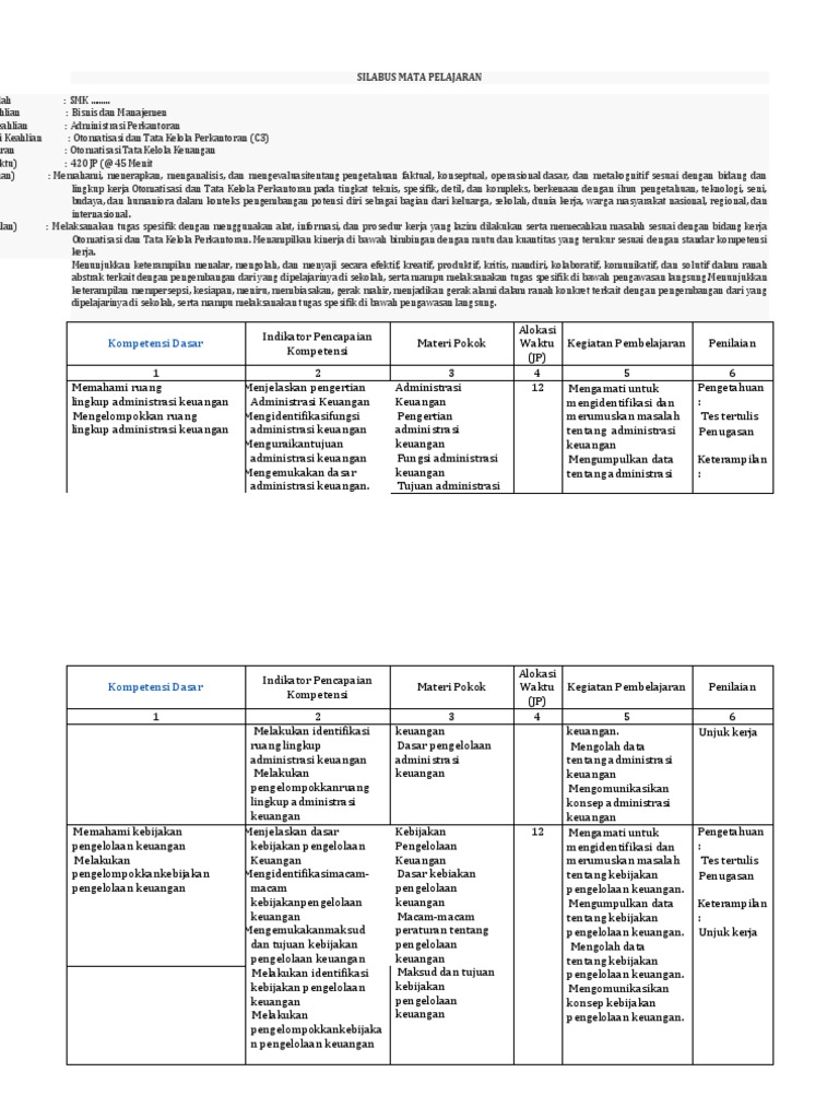 Silabus Otomatisasi Dan Tata Kelola Keuangan from imgv2-1-f.scribdassets.com Download rpp otomatisasi tata kelola keuangan smk kelas xi xii kurikulum 2013 revisi 2017 2018 semester ganjil dan genap jurusan perkantoran / otkp. Rpp 1 lembar smk mak produktif k 13 jurusan otomatisasi tata kelola perkantoran c1 c2 c3 shopee indonesia. Sekaitan dengan penerapan silabus otomatisasi tata kelola sarana dan prasarana baru dapat diimplementasikan pada saat siswa atau peserta didik kelas x tahun ajaran 20172018 telah naik ke kelas xi dan kelas xii pada tahun pelajaran 2018 2019. Silabus otomatisasi tata kelola kepegawaian kelas xii kurikulum 2013 revisi guru ilmu sosial. Silabus otomatisasi tata kelola kepegawaian kelas xii 6ng25r5g0jlv. Xi & xii durasi (waktu) : Mata pelajaran otomatisasi tata kelola keuangan merupakan transformasi dari mata pelajaran administrasi perkantoran yang diganti namanya pada kurikulum 2013 edisi revisi 2017. Download buku otomatisasi tata kelola kepegawaian kelas xii guru ilmu sosial.